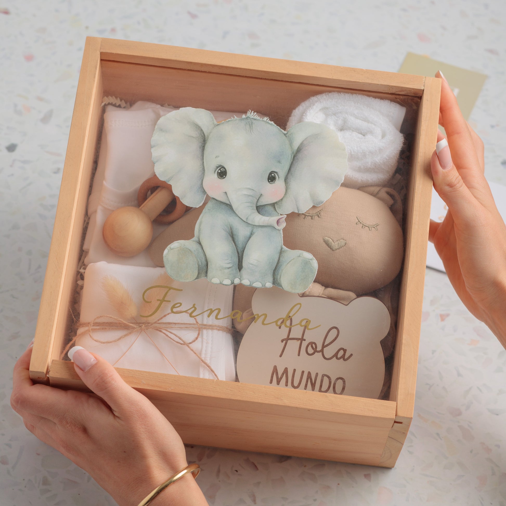 - 1 Caja de pino reutilizable con diseño de un elefante y nombre en la tapa a vinil